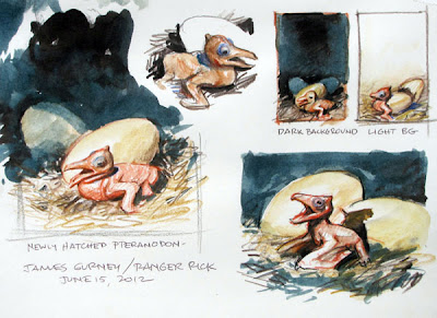 "The hatchling picture is vignetted so it will fit in the lower corner of the page. I gave the egg the appearance of a soft reptilian-type eggshell, and made the hatchling comparatively precocial. I followed David Unwin's summary of the recent pterosaur hatchling fossil discoveries, which suggests they probably didn't need much if any altricial parenting. Also, apparently they could fly quite soon after hatching. This affects the way I paint the little guy. I'll make sure to make him look more flight-ready than he appeared in the sketch."